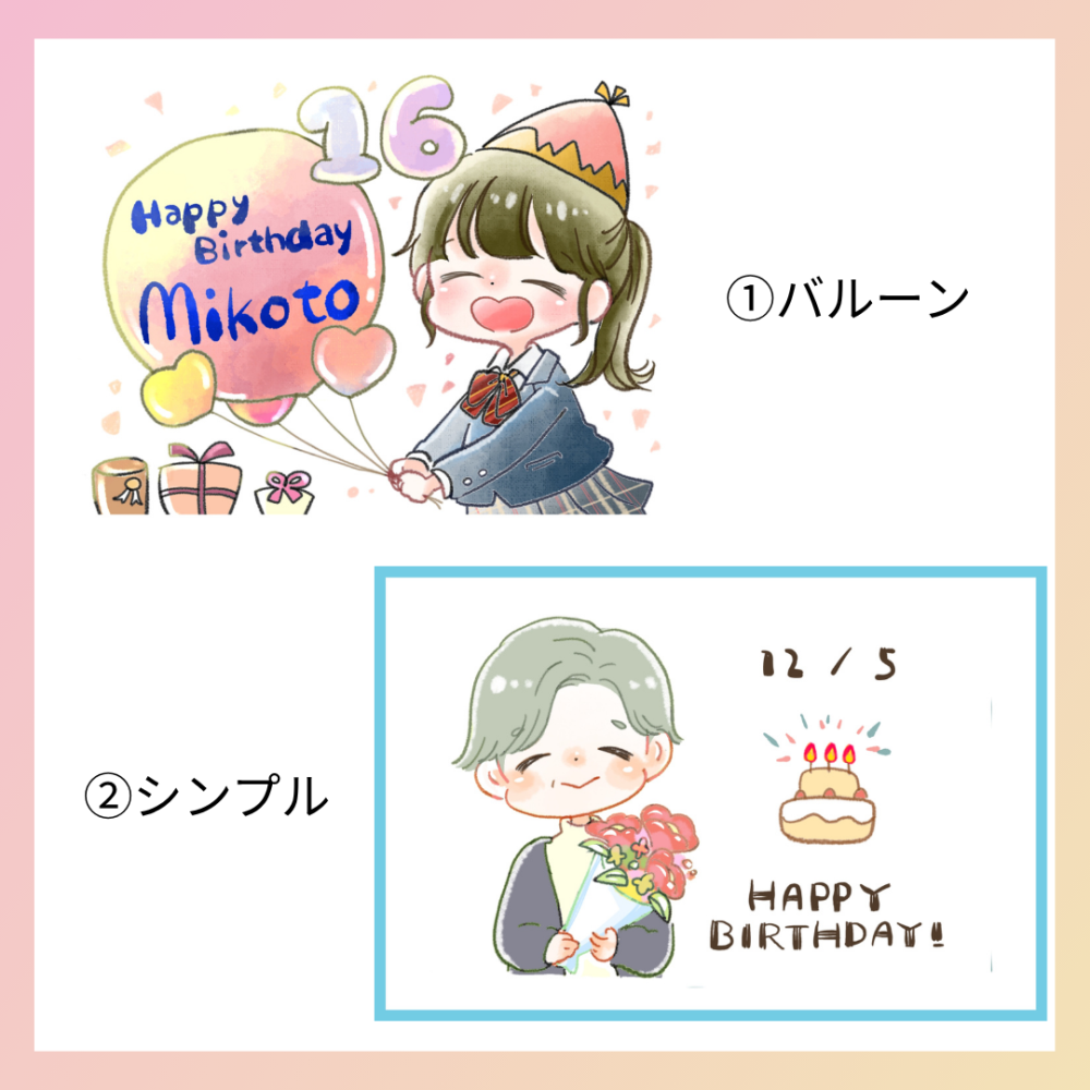 イラストレーターのbethさんが写真をもとにバースデーカード用にバストアップの似顔絵を描きます。作品データは個人利用の範囲でご利用ください。 <納期>内容の決定後、約60日(前後あり) <構図> ・モデル(バストアップ)+お名前+メッセージ+小物 ・サンプル①バルーン/②シンプルのどちらかをお選びいただきます(バルーンデザイン変更可) ・メッセージ指定可 ・小物(バースデー帽、ケーキ、花など)指定可 <ポーズや表情> ・ポーズや表情の指定可(ご希望がない場合、お任せとなります) ※ポーズ:指定の場合、参考写真または説明必須(サンプル作品と同じ、なども可能です)。(例 サンプル①ご希望で、片手はバルーン・片手はピースしてほしいも対応可) ※表情:にこにこした目か開いた目かなど指定いただけます(その他の場合、参考写真または説明必須)。 <背景色>ご希望をお聞きできます(ご希望がない場合、お任せとなります) <備考> ・当プランでリクエストできるモデルは1人までです ・オプションにて人数追加可(1名追加ごと+5,000円) ・動物も1モデルと数えます ご当選後のヒアリングにて下記項目などをご回答いただきます。 ・参考写真 ・ご希望の構図(サンプル①バルーン/②シンプル) ・ご希望する背景色、メッセージ、小物(いずれもお任せ可) |