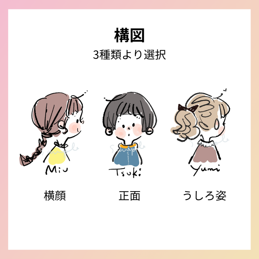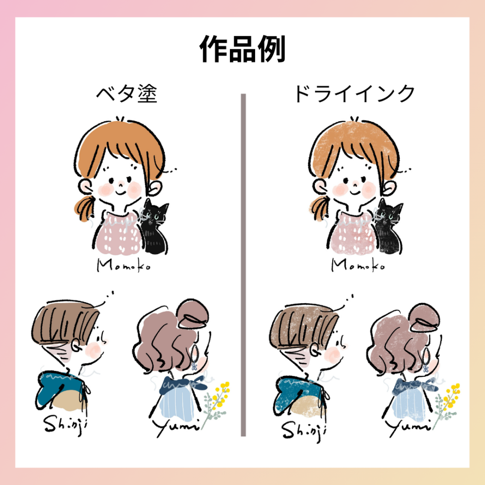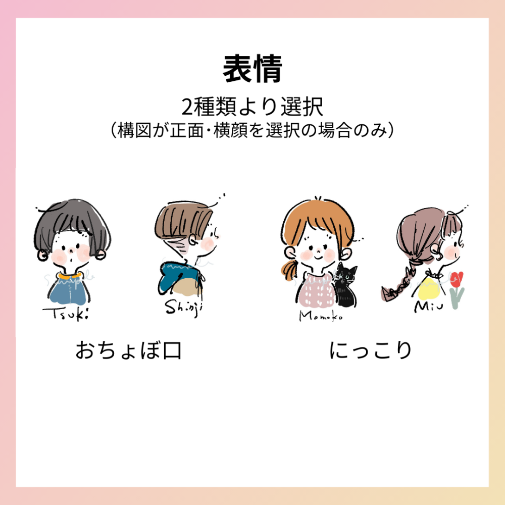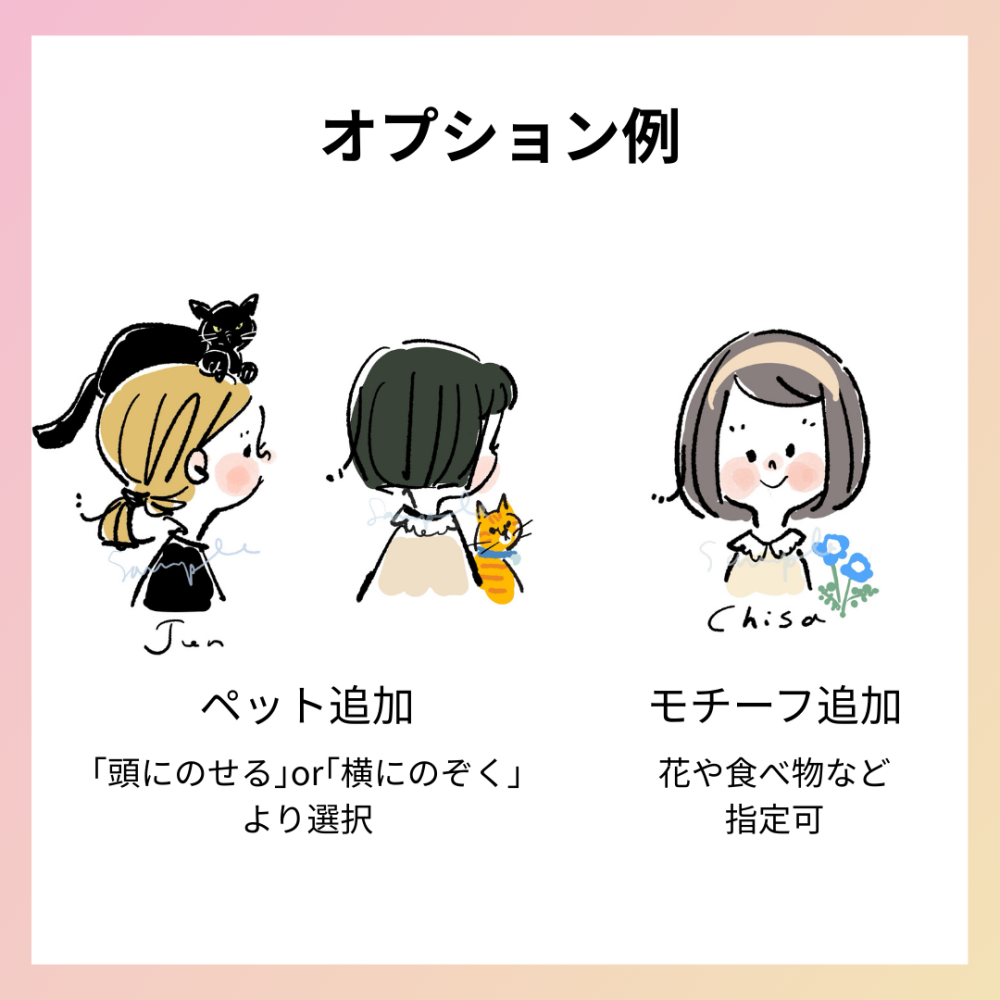 イラストレーターののりcorinさんがお写真を元に描き下ろしの似顔絵作品を制作します。作品データは個人利用の範囲でご利用ください。 <納期>内容の決定後、約30日(前後あり) <構図> ・正面、横顔、うしろ姿より1種を選択(サンプルをご参照ください。ポーズ等なし) ・正面、横顔をご希望の場合、表情を「にっこり」「おちょぼ口」より選択いただきます。 ・オプションにてペットやモチーフの追加が可能 <塗り方と色> ・ベタ塗、ドライインクより1種を選択 ・少な目の色数やモノクロをご希望などリクエスト可 <背景>単色白のみ <文字表記>お名前など可 <備考>当プランでリクエストできるモデルは1人までです <オプション> ・ペット追加(1匹ごと+2,000円) ※構図は、頭にのせる・横にのぞくより1種を選択(ペットのポーズは作者おまかせ) ※ペットが複数の場合、構図は作者おまかせとなります。 ・モチーフ追加(+1,000円) ※花や食べ物など小さなモチーフ1点のみ追加可 ヒアリングにて下記項目などをご回答いただきます。 ・参考写真 ・ご希望する構図、表情、塗り方、文字表記 |
