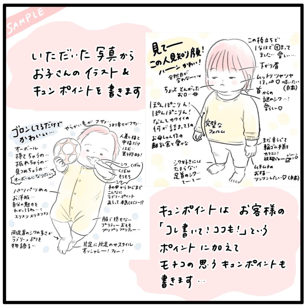 漫画家・イラストレーターのモチコさんが、お子様の「クレイジー成長記録」を描きおろしで制作します。お写真をもとにしたイラストと、キュンポイントも一緒に描いた作品2種を納品します。ご自身のXやInstagramなど各種SNSでの投稿やアイコンや待ち受け画像にご使用いただける他、個人利用の範囲で印刷してご活用いただけます。 【納期】内容の決定後、約60日(前後する場合あり) 【背景】作者におまかせ 【キュンポイント】 ・ヒアリングにてご回答いただけます ・お客様のご回答に作者が追加して描きます 【備考】当プランでリクエストできるモデルは2人までです ご当選後のヒアリングにて下記項目などを提供いただきますので、予めご用意ください。 ・モデルの写真(中央に描くイラスト用) ・キュンポイント(周囲に配置する文字用) ●注意事項 ・作品は作者のSNSやKAYTE等で紹介する場合がございます。 ・制作物の著作権は全てクリエイターに帰属します。 ・個人利用以外の商用・二次利用は禁止です。 ●お申込み方法 ユーザー登録後、入力フォームの全項目にご記入ください。 ・作家性を尊重し、ラフ確認・修正対応は行っておりません。 ・当落結果はご登録のメールアドレス宛にご連絡いたします。 ・当選者は、メール記載の案内に従いヒアリングフォームにご回答ください。 ・「system@kayte.jp」からのメールを受信できるよう設定をお願いします。 ・申込内容とヒアリング内容を確認後、金額を確定し、クリエイター同意をもって正式受注となります。 ・自動配信メールにて金額をご案内しますので、ご確認のうえお支払いください。 ・お支払い完了後、制作を開始します。 ・提示金額(税込)に加え、購入者手数料10%が発生します。 |