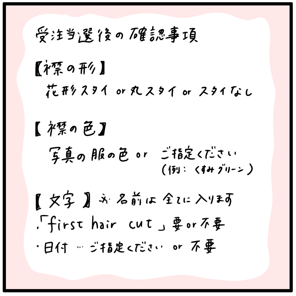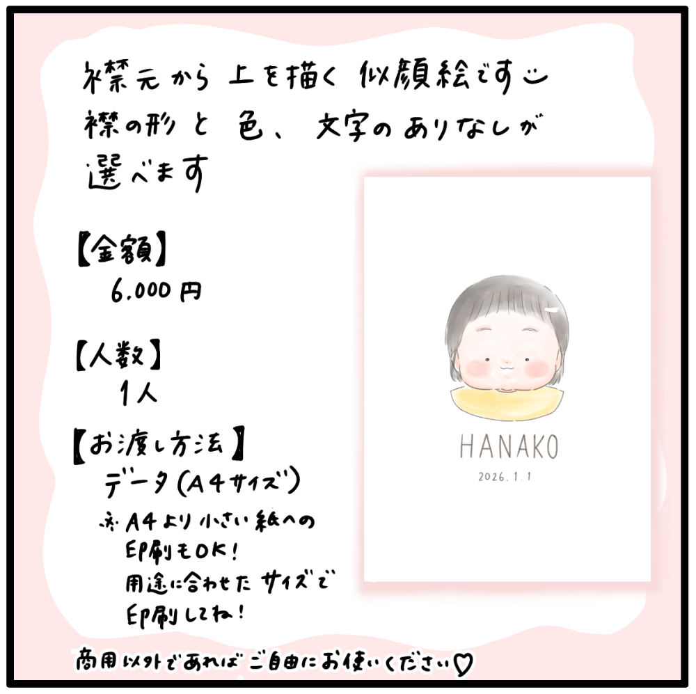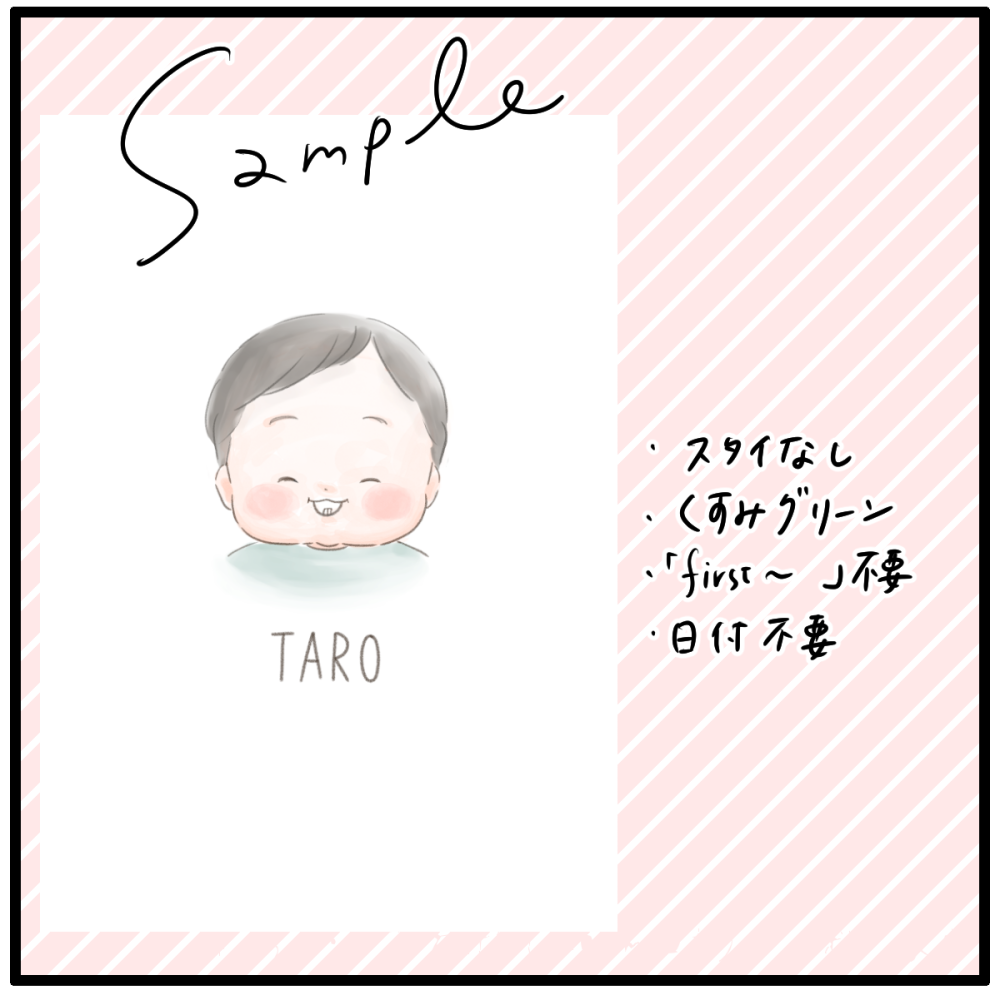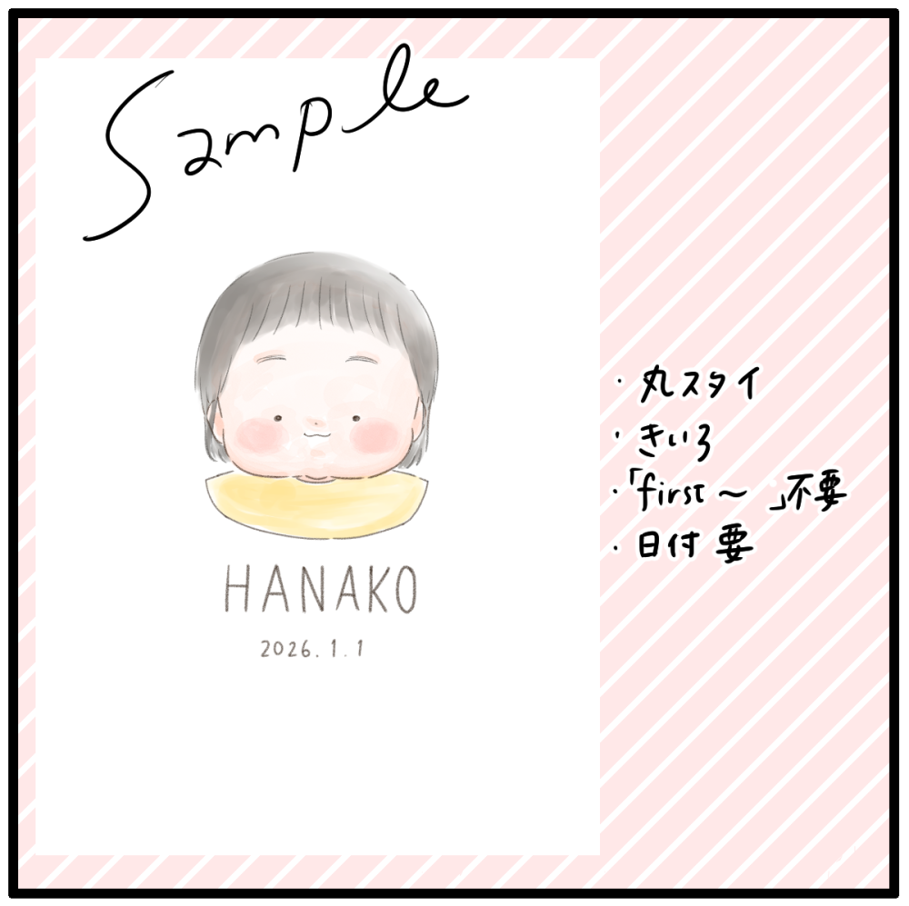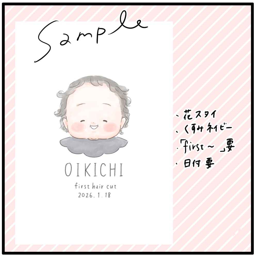 漫画家・イラストレーターのモチコさんが、写真をもとに、アイコンやファーストカットで使える 似顔絵を描きます。作品データは個人利用の範囲でご利用ください(ご自宅用の印刷等が可能)。 <納期>内容の決定後、約30日(前後あり) <構図> ・サンプル参照(ポーズ等は承れません) ・モデル+お名前(固定) +フレーズ+ご希望する日付 ・フレーズ「first hair cut」 <備考> ・当プランでリクエストできるモデルは1人までです ご当選後のヒアリングにて下記項目などをご回答いただきます。 ・参考写真 ・お名前 ・襟の形 (花スタイ・丸スタイ・スタイなし) ・襟の色(写真の服の色、または指定) ・フレーズ「first hair cut」の要・不要 ・日付の要・不要(要の場合、具体的な日付) |