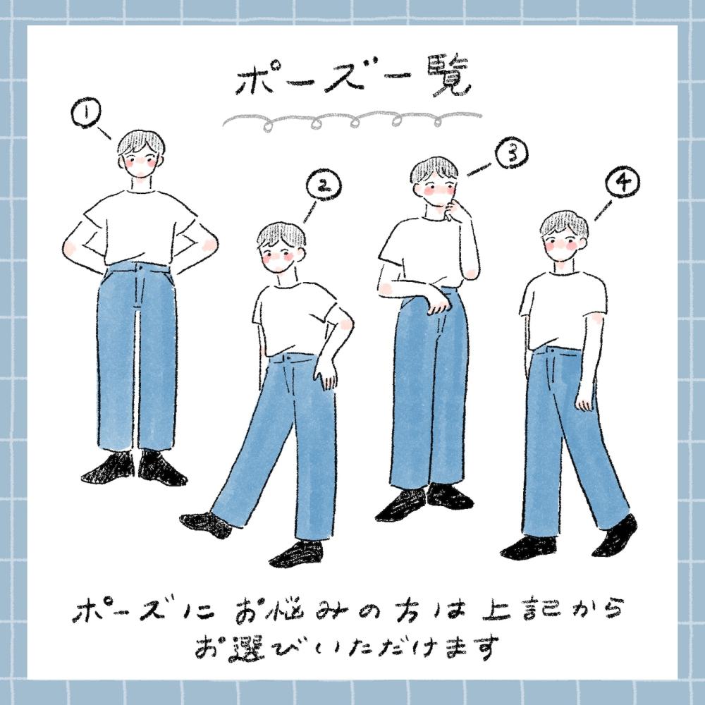 ・ご提供いただくお写真のポーズにて制作します。ご希望するポーズのお写真のご用意をお願いします。 ・ポーズを取ったお写真のご用意が難しい方やポーズに悩む方はサンプル4種より1種をお選びいただくことも可能です。 ・背景色は白のみです |