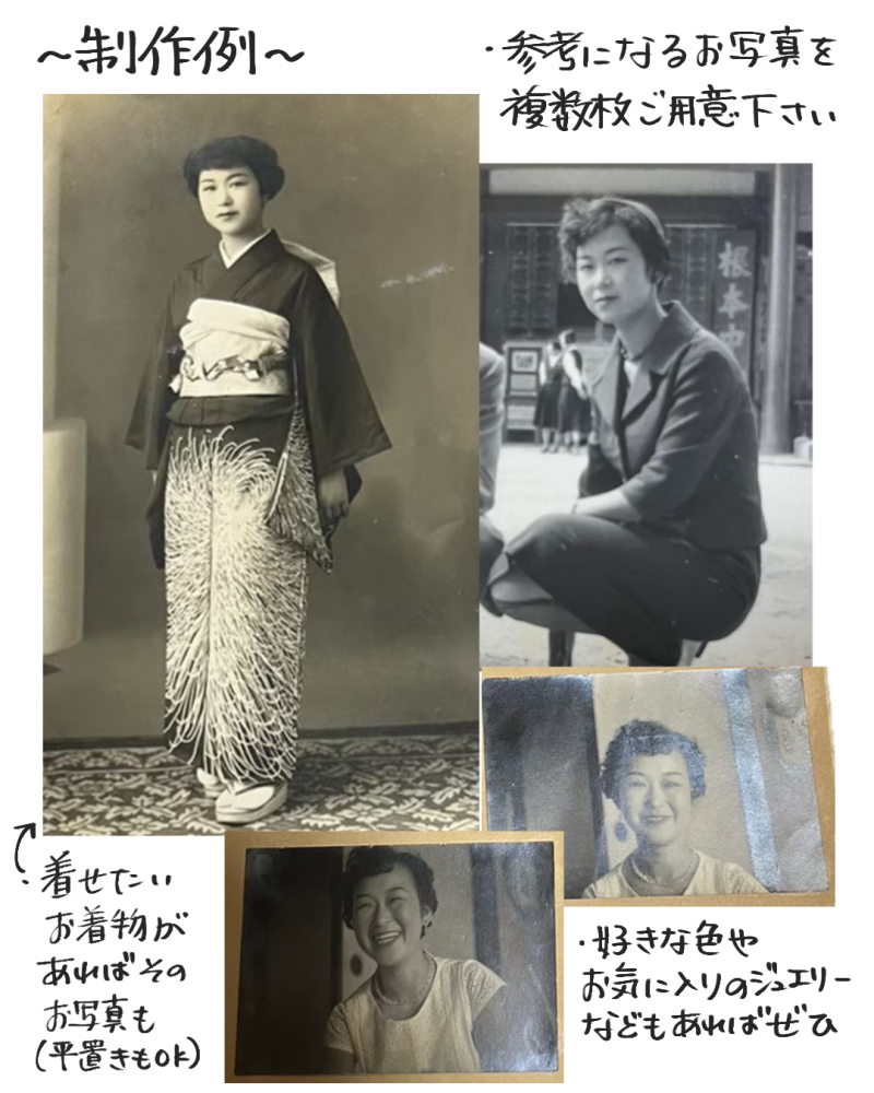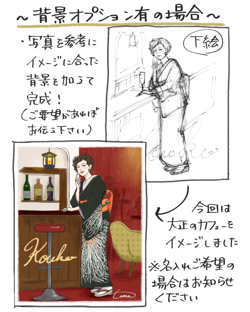 イラストレーターのtomekkoさんがお客様の写真をもとに着物姿のイラスト作品を制作します。完成データは個人利用の範囲にてご使用ください。 <納期>内容の決定後、約60日(前後あり) <構図・ポーズ> ・全身 ・ポーズは作者おまかせ ・ご指定のポーズがある場合は指定可(参考画像の提供必須) <背景デザイン> ・単色(お好きなカラーをご指定いただけます) ・オプションにて背景デザインの追加が可能(ご希望するイメージをご回答いただき詳細は作者おまかせとなります。+5,000円) <文字表記>可(ローマ字) <備考> ・当プランでリクエストできるモデルは1人までです ・オプションでモデル追加可(1モデル追加ごと+5,000円) ※動物も1モデルと数えます ご当選後のヒアリングにて下記項目などをご回答いただきます。 ・参考写真(モノクロ・カラーいずれも可。ご希望のカラーがあれば指定可。特になければ作者おまかせのカラーで描きます。) ・ご希望する背景色、文字表記 |