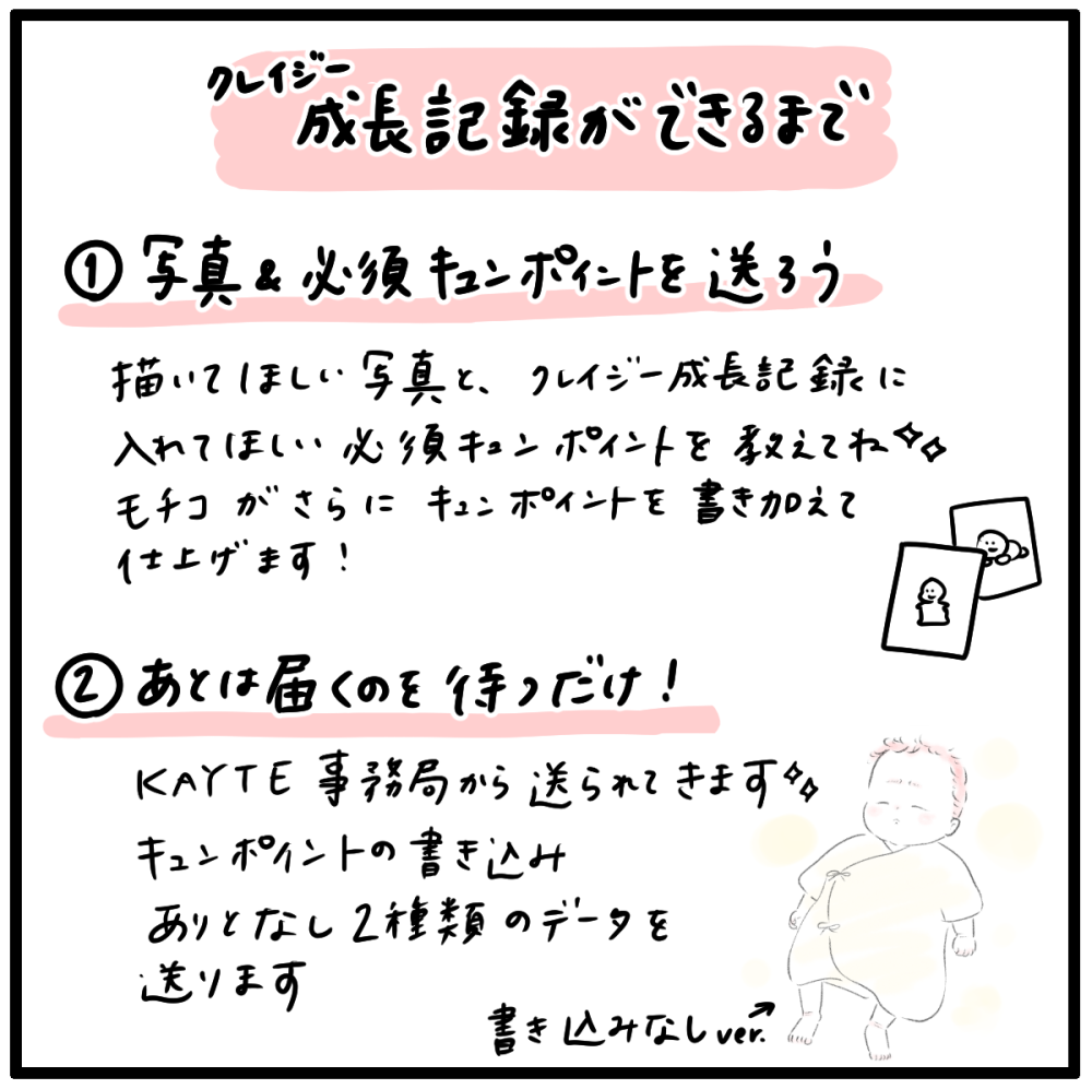 漫画家・イラストレーターのモチコさんが、お子様の「クレイジー成長記録」を描きおろしで制作します。お写真をもとにしたイラストと、キュンポイントも一緒に描いた作品2種を納品します。ご自身のXやInstagramなど各種SNSでの投稿やアイコンや待ち受け画像にご使用いただける他、個人利用の範囲で印刷してご活用いただけます。 【納期】内容の決定後、約60日(前後する場合あり) 【背景】作者におまかせ 【キュンポイント】 ・ヒアリングにてご回答いただけます ・お客様のご回答に作者が追加して描きます 【備考】当プランでリクエストできるモデルは2人までです ご当選後のヒアリングにて下記項目などを提供いただきますので、予めご用意ください。 ・モデルの写真(中央に描くイラスト用) ・キュンポイント(周囲に配置する文字用) ●注意事項 ・作品は作者のSNSやKAYTE等で紹介する場合がございます。 ・制作物の著作権は全てクリエイターに帰属します。 ・個人利用以外の商用・二次利用は禁止です。 ●お申込み方法 ユーザー登録後、入力フォームの全項目にご記入ください。 ・作家性を尊重し、ラフ確認・修正対応は行っておりません。 ・当落結果はご登録のメールアドレス宛にご連絡いたします。 ・当選者は、メール記載の案内に従いヒアリングフォームにご回答ください。 ・「system@kayte.jp」からのメールを受信できるよう設定をお願いします。 ・申込内容とヒアリング内容を確認後、金額を確定し、クリエイター同意をもって正式受注となります。 ・自動配信メールにて金額をご案内しますので、ご確認のうえお支払いください。 ・お支払い完了後、制作を開始します。 ・提示金額(税込)に加え、購入者手数料10%が発生します。 |
