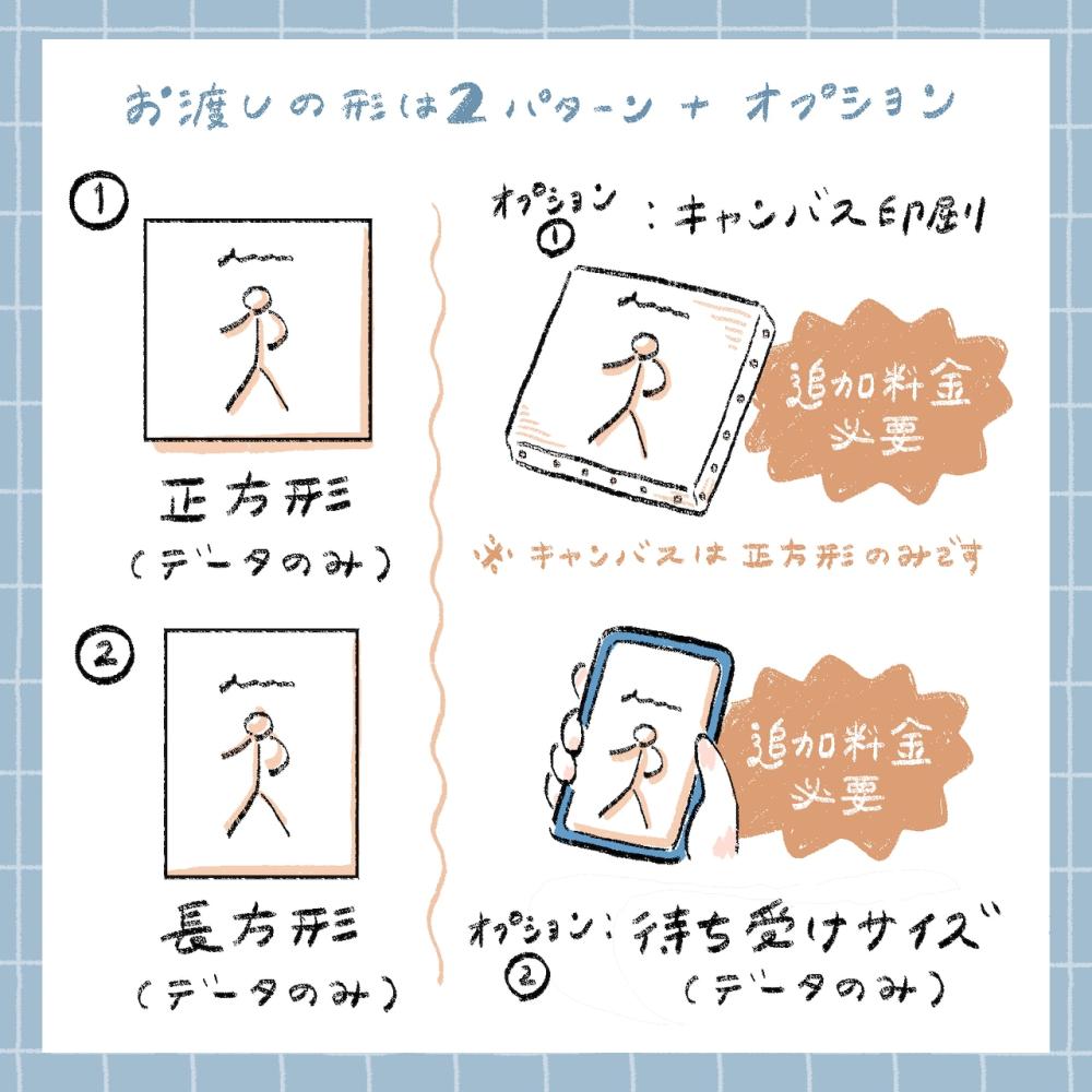 イラストレーターのaya.mさんが、お写真を元に描き下ろしの全身イラストを制作します。ご希望の表情を選べるオーダーメイド作品です(表情お任せ可)。作品サイズは正方形・長方形の2種から選択可能。オプション(有料)でモデル人数の追加やスマートフォン向けの「待ち受けサイズ」も対応。完成作品はSNSアイコンや額装など、個人利用の範囲で使用いただけます。 【納期】内容決定後、約45日(前後あり) 【表情】サンプルから選択(お任せも可) 【文字表記】名前のみ可 【備考】 ・当プランではモデルは1名様です ※オプションで追加可です ※2名の場合30,000円、2名以降1名追加ごと+8,000円 ・オプション:待ち受けサイズ(+1,000円) ※キャンバス付きは別プランです <オプション 待ち受けサイズ> ・正方形or長方形作品+待ち受けサイズの2種を納品 ・ヒアリングにてご使用機種をご回答いただきます ご当選後のヒアリングで以下をご提供いただきます ・参考写真(ポーズ・服装等) ・ご希望の表情(サンプルより選択) |