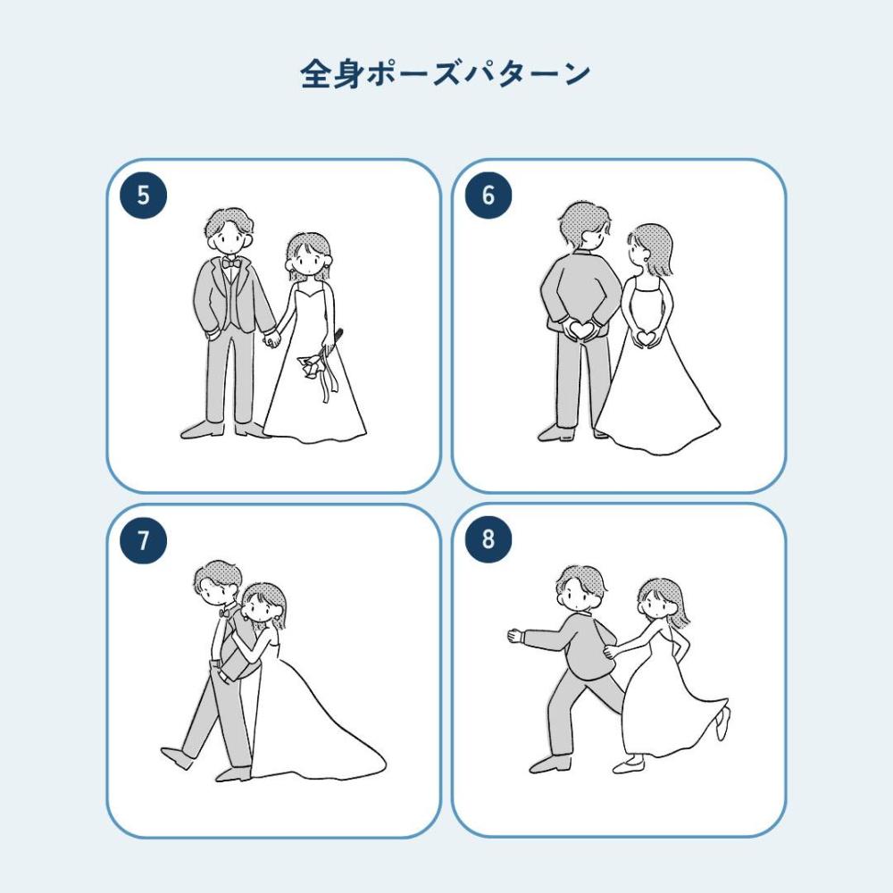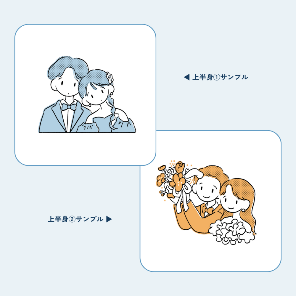 ・上半身 ・サンプルより選択(ブーケデザインは指定またはサンプルと同じ) ※例:ポーズ①にブーケを追加したい場合、有料オプションとなります(アイテム追加+2,000円) |