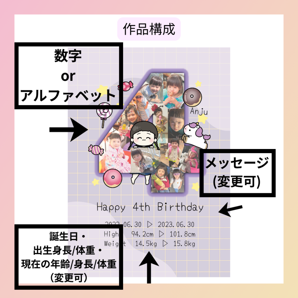 イラストレーターのおぐらもぐさんが、お写真を組み合わせた数字と描き下ろしの似顔絵作品を制作します。作品データは個人利用の範囲でご活用いただけます。 <納期>内容の決定後、約60日(前後あり) <ポーズ>別途希望がある場合、お写真以外のポーズで制作可 <フォント>サンプルより選択 <作品構図> ・数字…アルファベット1文字も可 ・誕生日、出生身長/体重…メッセージなどに変更可 <備考> ・モデルはお一人のみ ・「額入り画像」は飾りイメージです。作品はデータのみのお届けとなります ・モチーフは権利の都合上特定のキャラクターは描けません お申込み後のヒアリングにて下記項目などをご提供いただきます。 ・参考写真 ・ご希望のフォント、数字またはアルファベットなど ・お好きな色・モチーフ・動物など ●注意事項 ・作品は作者のSNSやKAYTE等で紹介する場合がございます。 ・制作物の著作権は全てクリエイターに帰属します。 ・個人利用以外の商用・二次利用は禁止です。 ●お申込み方法 ユーザー登録後、入力フォームの全項目にご記入ください。 ・作家性を尊重し、ラフ確認・修正対応は行っておりません。 ・お申込み後の案内に従いヒアリングフォームにご回答ください。 ・「system@kayte.jp」からのメールを受信できるよう設定をお願いします。 ・申込内容とヒアリング内容を確認後、金額を確定し、クリエイター同意をもって正式受注となります。 ・自動配信メールにて金額をご案内しますので、ご確認のうえお支払いください。 ・お支払い完了後、制作を開始します。 ・提示金額(税込)に加え、購入者手数料10%が発生します。 |